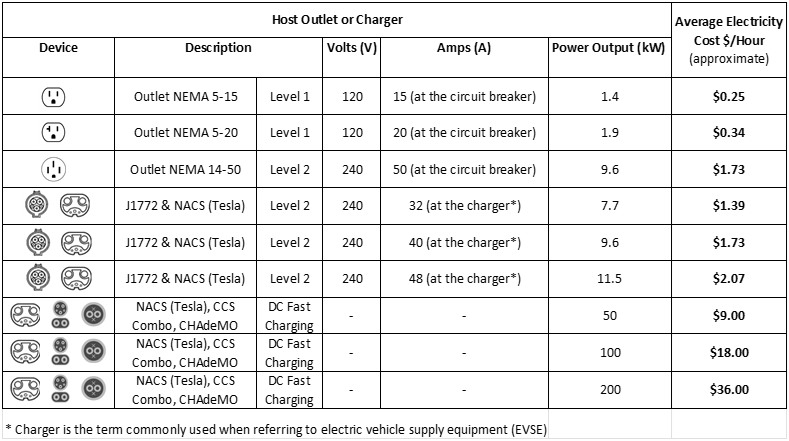 For an EV charger (EVSE):  Hosts will need to know the volts and amps output setting at the charger (EVSE), or the power (kW) output setting at the charger (EVSE).